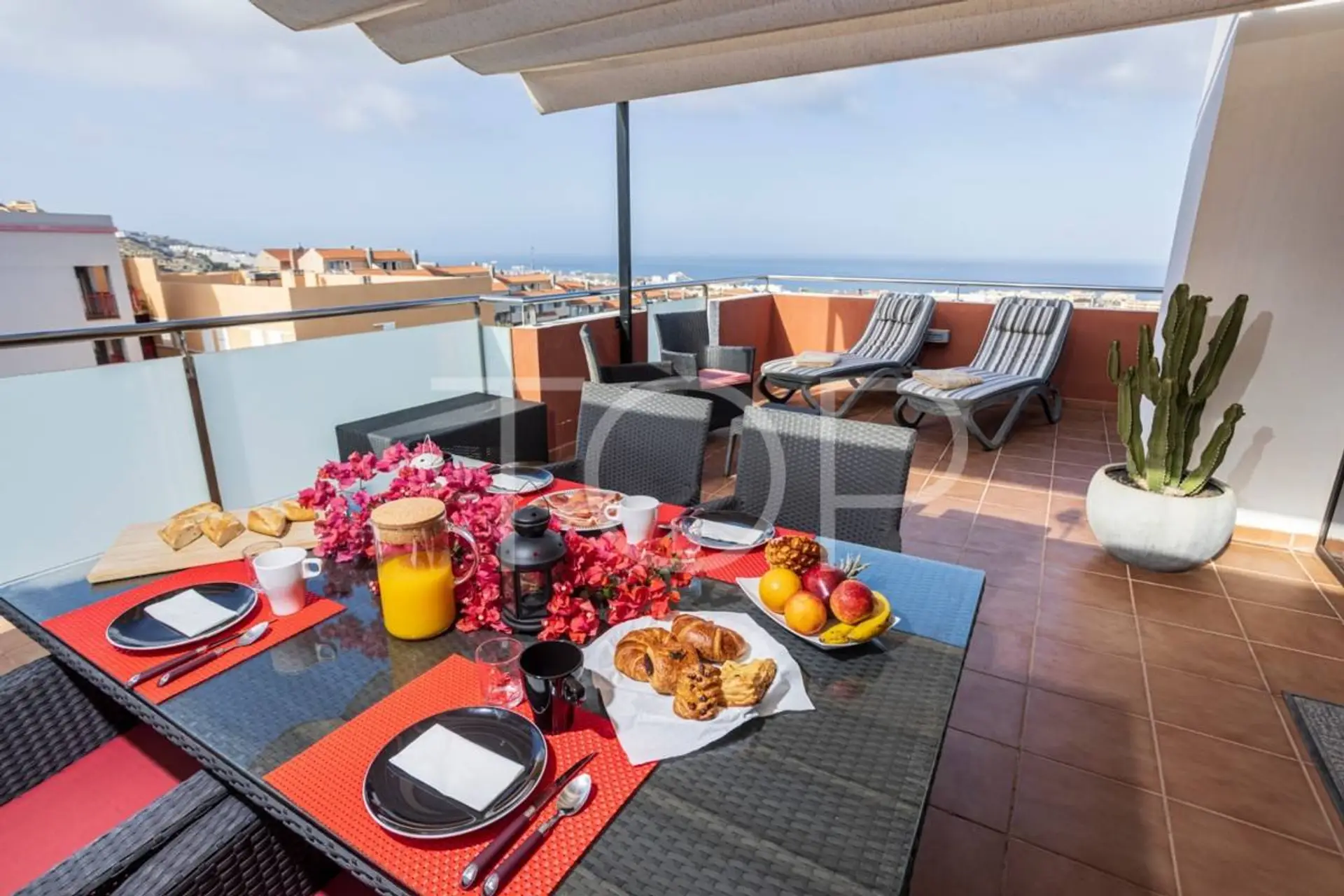 Modern and nicely decorated apartment available for rent in a very private and quiet area of Madroñal. The apartment consists of two bedrooms - one with kingsize bed, the second with two single beds, living room with TV, wifi.. balcony, fully equipped kitchen, two bathrooms, one with bathtub, one with shower. Upstairs there is a separate living area with sofa bed and the entrance to the spacious and sunny terrace with sun loungers, furniture and incredible sea views. Parking space in garage included in the price. Comfortable, luxurious and private accommodation.