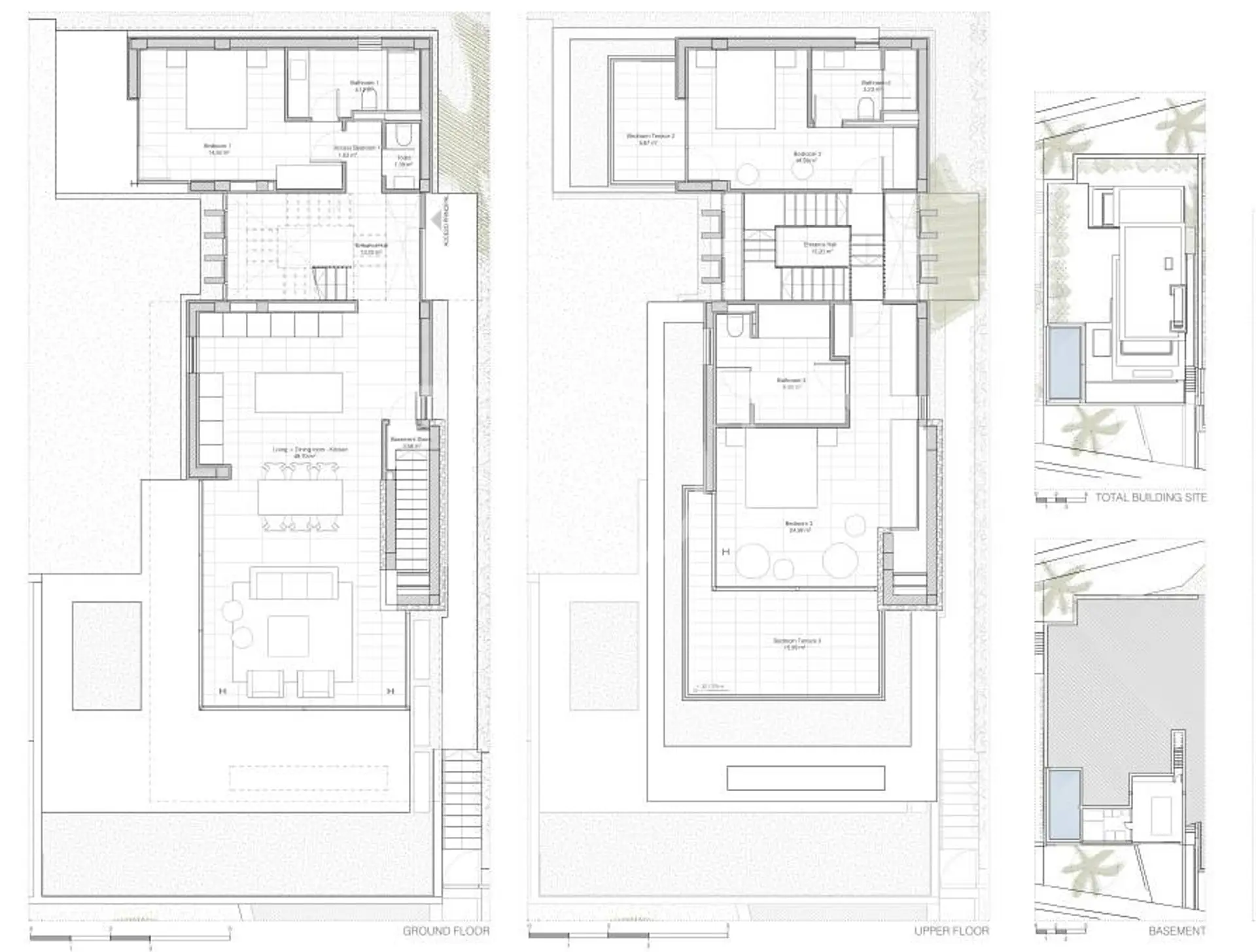 Each property also features its own private garden with swimming pool, as well as a basement level with garage.