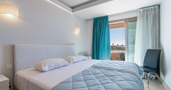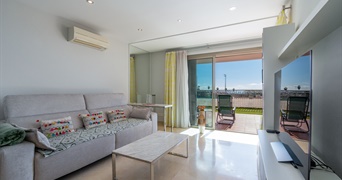 The living room is very spacious and features a dining area as well as a fully equipped open plan kitchen. You will access the terrace through large glass doors from the living room and from the kitchen.