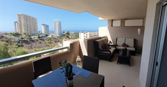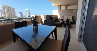El salón-comedor es luminoso y espacioso, proporcionando un ambiente acogedor y relajante, mientras que la amplia terraza te permitirá disfrutar de impresionantes vistas al mar, las montañas y la zona de Playa Paraíso, creando un espacio perfecto para relajarte al aire libre.