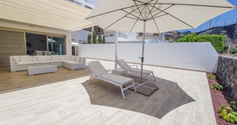 Buiten lonkt een groot terras met voldoende ruimte om buiten te eten en te ontspannen in de zon.