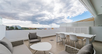 Эта светлая двухуровневая квартира, расположенная на верхнем этаже Caleta Palms, предлагает комфорт, современность и великолепные виды на море.