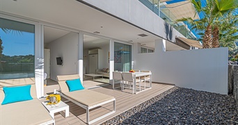 Современные одноэтажные апартаменты с просторной кухней с островом, ванной комнатой с двойной раковиной и душевой кабиной, открытой гостиной и большой солнечной террасой в саду. Он может вместить до четырех человек благодаря своей гардеробной кровати в гостиной.