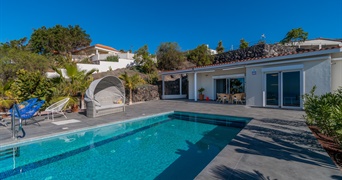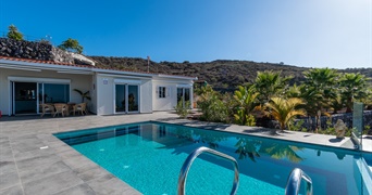 Das Haupthaus verfügt über eine lichtdurchflutete offene Küche mit Wohnbereich sowie zwei großzügige Schlafzimmer, die jeweils direkten Zugang zu Garten und Terrassen haben. Für ein nahtloses Innen-Außen-Wohnen konzipiert, nutzt das Haus das außergewöhnliche Klima der Insel optimal aus.