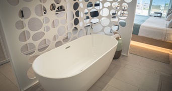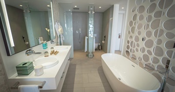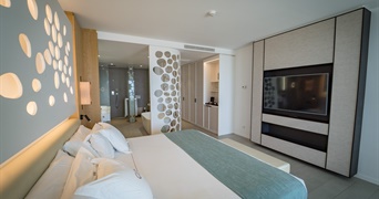 This Junior Suite has an illuminated king-size bed, a bathroom with double washbasin, a KRION bathtub, a spacious shower and a separate toilet. It also has individual built-in air conditioning.