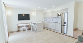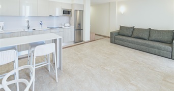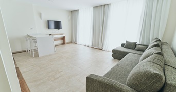 This apartment exudes elegance, with a spacious and cozy living room adorned with a comfortable sofa bed and a state-of-the-art television. Beyond the living room is a splendid 12 square meter terrace, offering a serene outdoor space to relax and enjoy the surroundings.