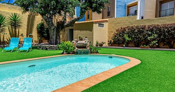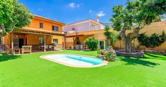 The property is distributed over two floors. On the ground floor, with entrance from the street, you will find the fully equipped kitchen with access to the back garden, the dining room and the living room opening up onto the terrace and swimming pool. There is also a guest toilet. The upper floor features the master bedroom with fitted wardrobes, dressing room/office area and a large en-suite bathroom with corner bathtub. This floor also offers two further double bedrooms, one with fitted wardrobes, and a family bathroom. All bedrooms have air conditioning.