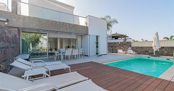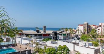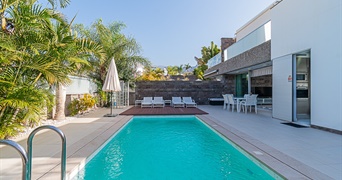 The upper floor also boasts a well-equipped office designed for work under the Tenerife sun, equipped with a stylish desk and a sofa bed. On the first floor of the villa, you'll find a spacious living room and a games room with a pool table. An inner courtyard graced with palm trees and exotic plants adds charm and brightness to the house. Two spacious bedrooms with lavish en-suite bathrooms and fitted closets are also found on this level.