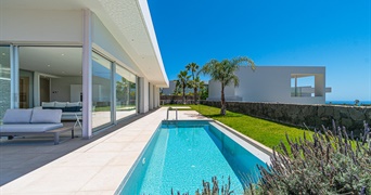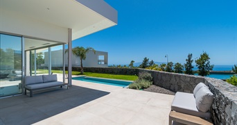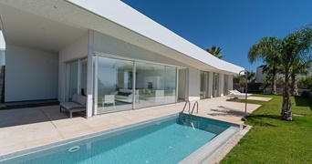 Esta villa es una de las seis viviendas unifamiliares situadas en la zona alta del complejo, junto al campo de golf y que cuenta con un diseño moderno y vistas al mar desde la terraza.