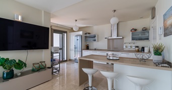 Este moderno apartamento de 133 m² disfruta de una agradable iluminación natural durante todo el día gracias a su orientación al sureste y los amplios ventanales de su espaciosa sala de estar, compuesta por una cocina abierta totalmente equipada, un acogedor salón y una zona de comedor. Este espacio diáfano se abre a una impresionante terraza de 103 m² que ofrece varias zonas de relax para disfrutar del excelente clima a lo largo de todo el año, así como estupendas vistas al mar. La cocina también brinda acceso a una parte cubierta de la terraza con un salón exterior.