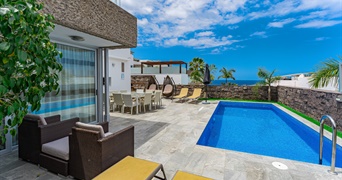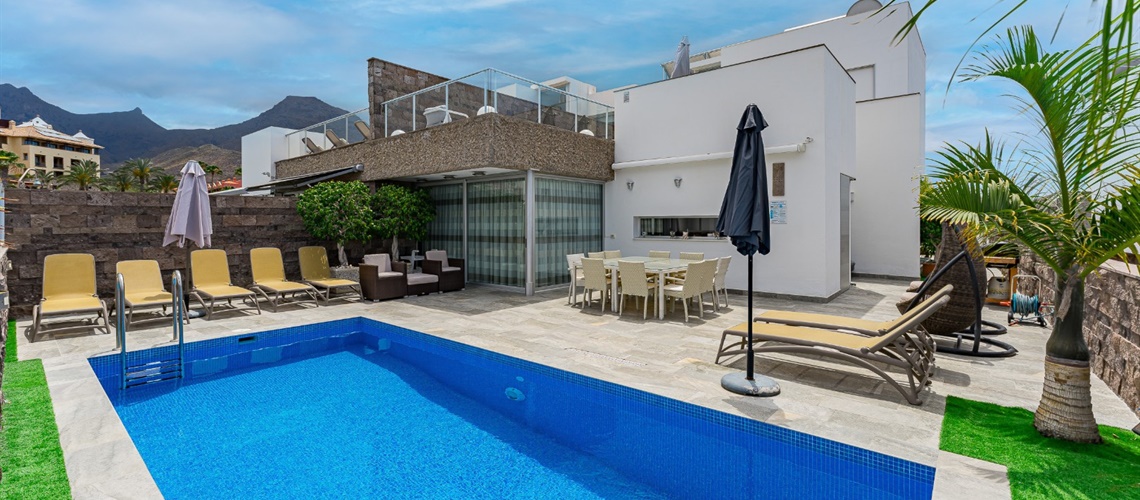 Luxueuse villa à louer à El Duque, cette villa est avec piscine privée chauffée. Situé en plein centre d'El Duque. À 5 minutes à pied de la belle plage de sable blanc d'El Duque, et à côté du centre commercial de luxe Plaza del Duque, ainsi que de 5 hôtels Sar, tels qu'Anthelia, Gran tacande, GF Victoria. La villa offre 5 chambres spacieuses, 4 salles de bain modernes aménagées, une cuisine moderne et entièrement équipée, grand salon, en bas il y a un salon supplémentaire, jardin d'hiver, au total 3 terrasses, piscine privée chauffée, garage spacieux, buanderie. La maison est très complète et a une situation unique. C'est parfait pour vos vacances, ainsi que pour vivre.