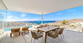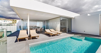 Il piano superiore è il cuore della casa: un ampio ambiente open space con elegante soggiorno, zona pranzo e cucina di design con isola centrale ed elettrodomestici di alta gamma. Le grandi vetrate lasciano entrare la luce e incorniciano le meravigliose viste sul mare. Sullo stesso livello si trovano un bagno per gli ospiti, la spettacolare piscina a sfioro riscaldata con doccia esterna e un’ampia terrazza solarium – il luogo perfetto per godere del clima mite delle Canarie tutto l’anno.