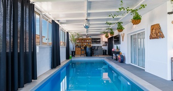 Een van de absolute hoogtepunten is het verwarmde binnenzwembad, dat het hele jaar door voor ontspanning in alle privacy zorgt. Deze uitnodigende ruimte wordt aangevuld met een eigen privébar – ideaal om gasten te ontvangen of gewoon heerlijk tot rust te komen.