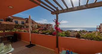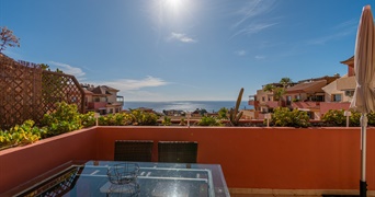 De woning geniet van een uitstekende ligging binnen het complex en beschikt over een ruim privéterras met aangenaam uitzicht op zee, de bergen en het zwembad, wat zorgt voor een ideale omgeving om te ontspannen en buiten te leven. Het terras is ingericht met ligstoelen en buitenmeubilair en is perfect afgestemd op het aangename klimaat het hele jaar door.